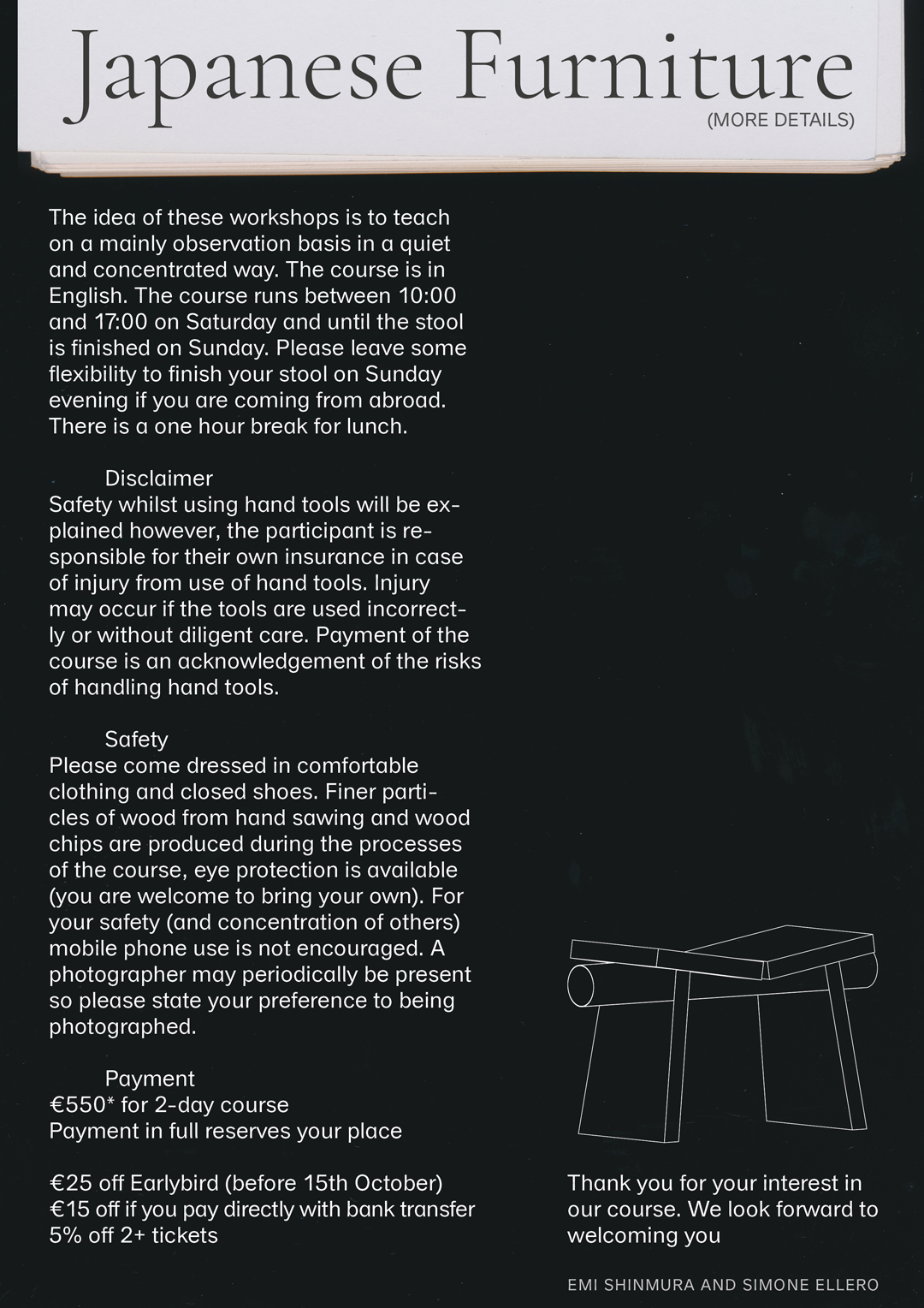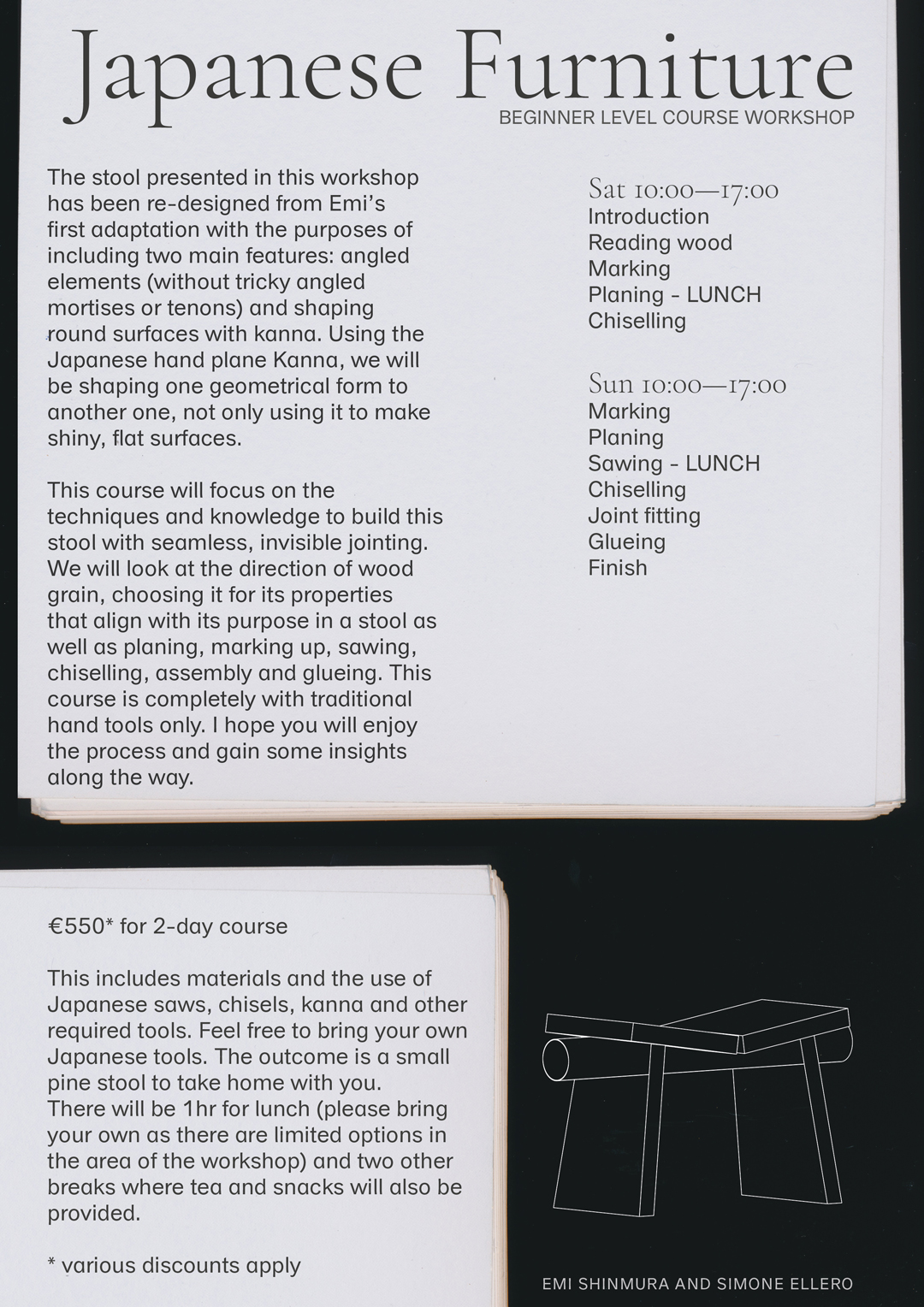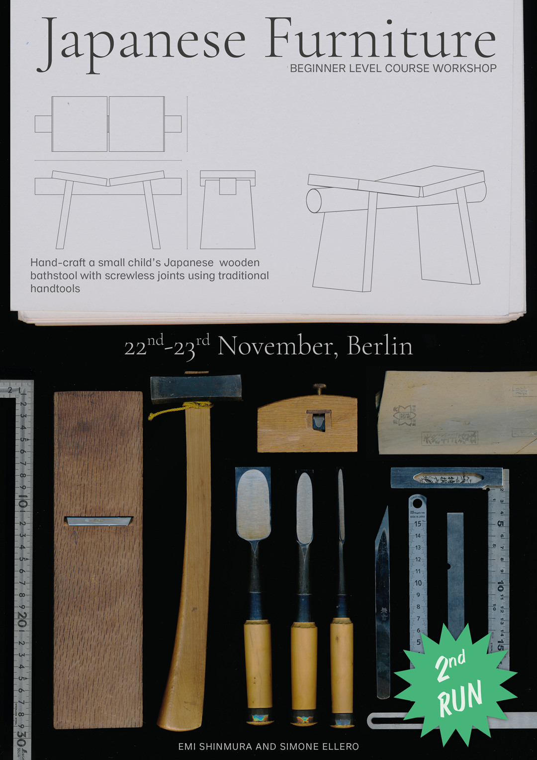 A long awaited stool-making workshop for beginners! The workshop will be run by myself and furniture-maker Simone Ellero. We’ve been redesigning the bath stool by combining our knowledge in Japanese woodworking—drawing from both carpentry and furniture-making traditions—to create a split-seat bath stool for practising various techniques and to take home afterwards!