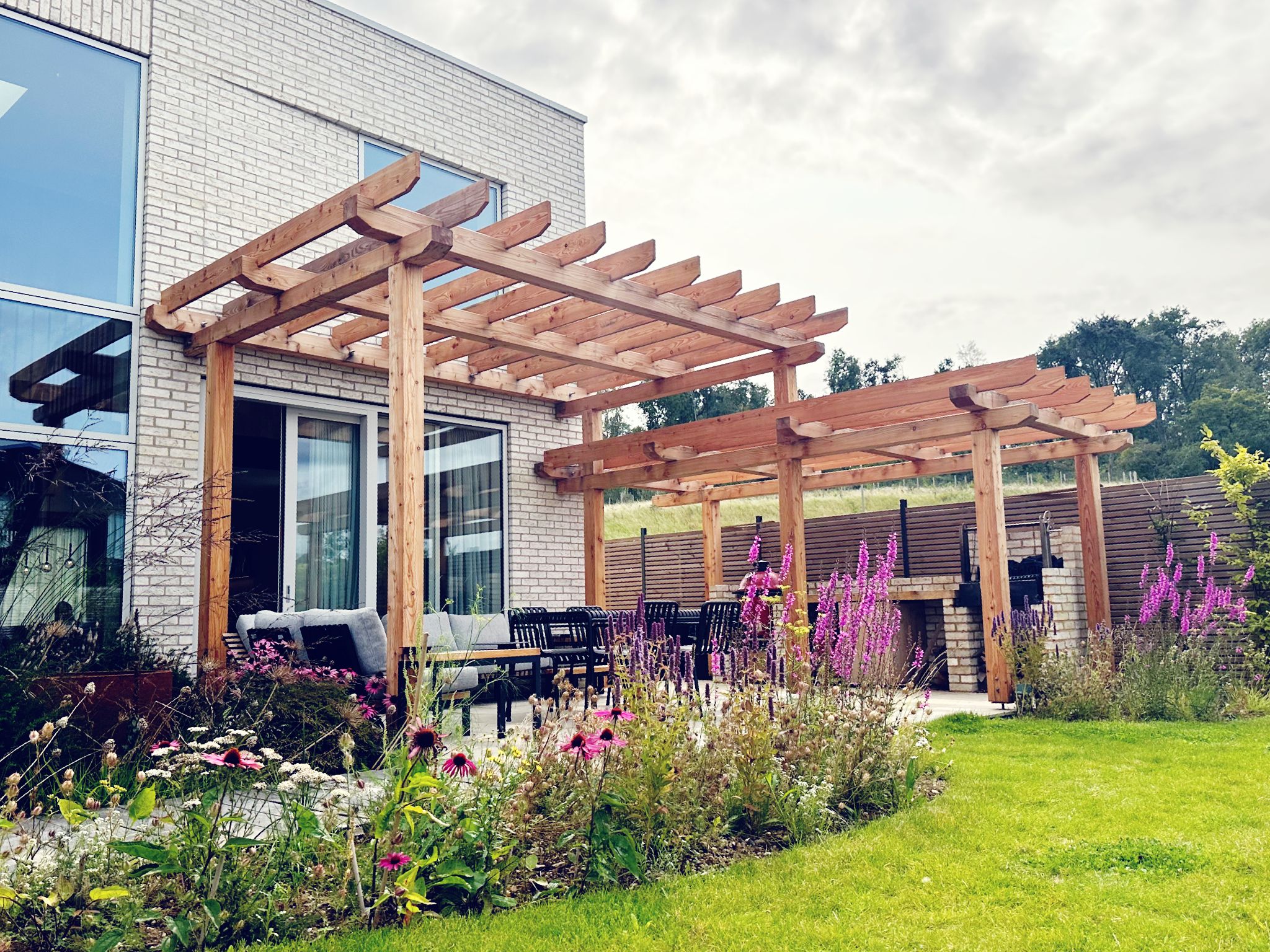 This shaded area to sit and enjoy the outdoors under a mature wisteria-trellis is designed as an addition to a modern self-build house in the Chiltern Hills area. The clients will build the structure themselves so we designed the form and joints together with other consultants. We created two main volumes to be shaded; a dining area and a smaller more shaded cooking area. Designed to last in outside conditions, simple, weather-resistant joints were chosen and located accordingly for maximum durability. With only wood-to-wood timber joinery, the large section (150mm square) timbers are held without diagonal bracing, relying on tight-fitting joinery, wooden pins and its own mass to remain stable and structurally sound.