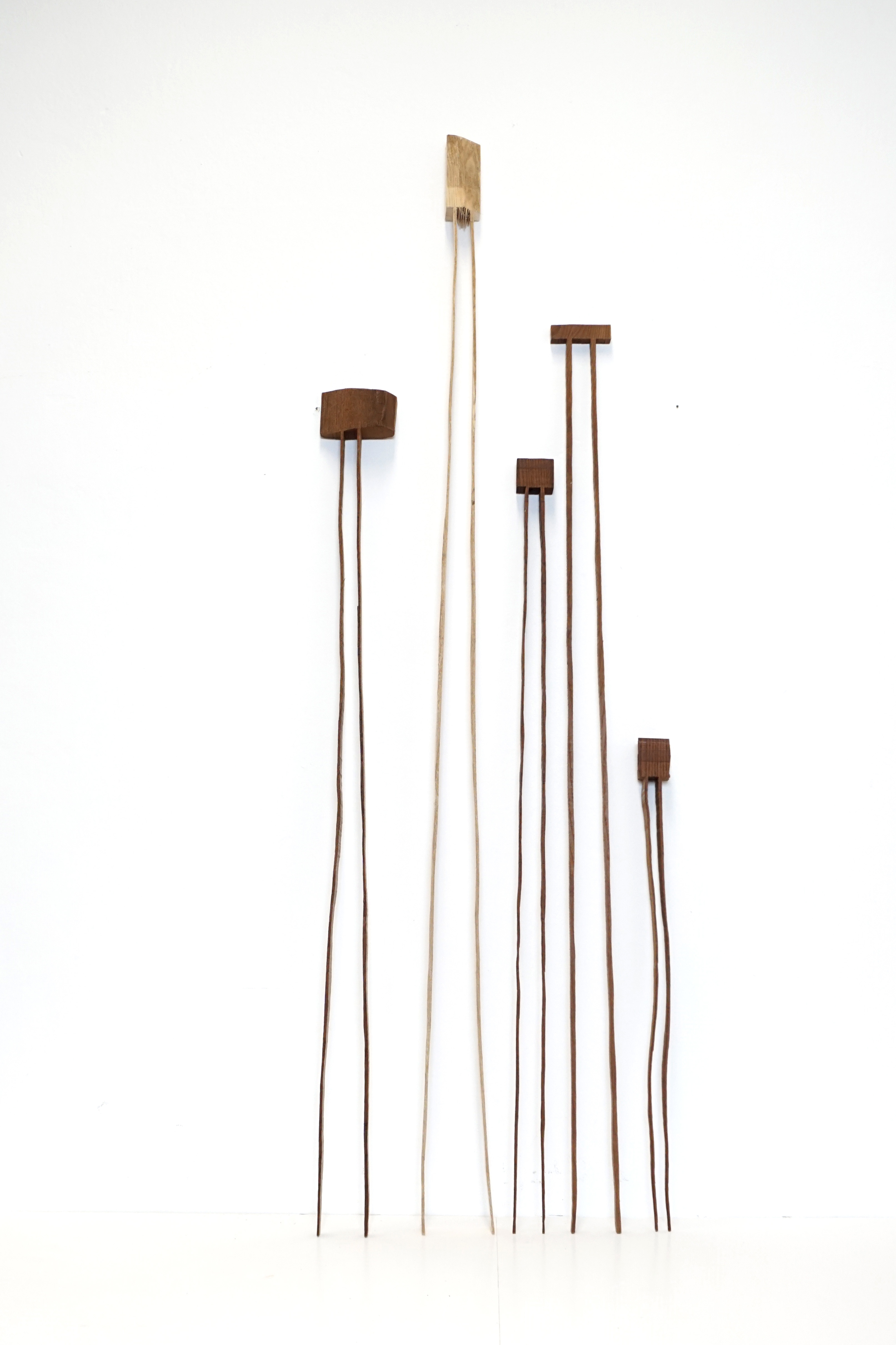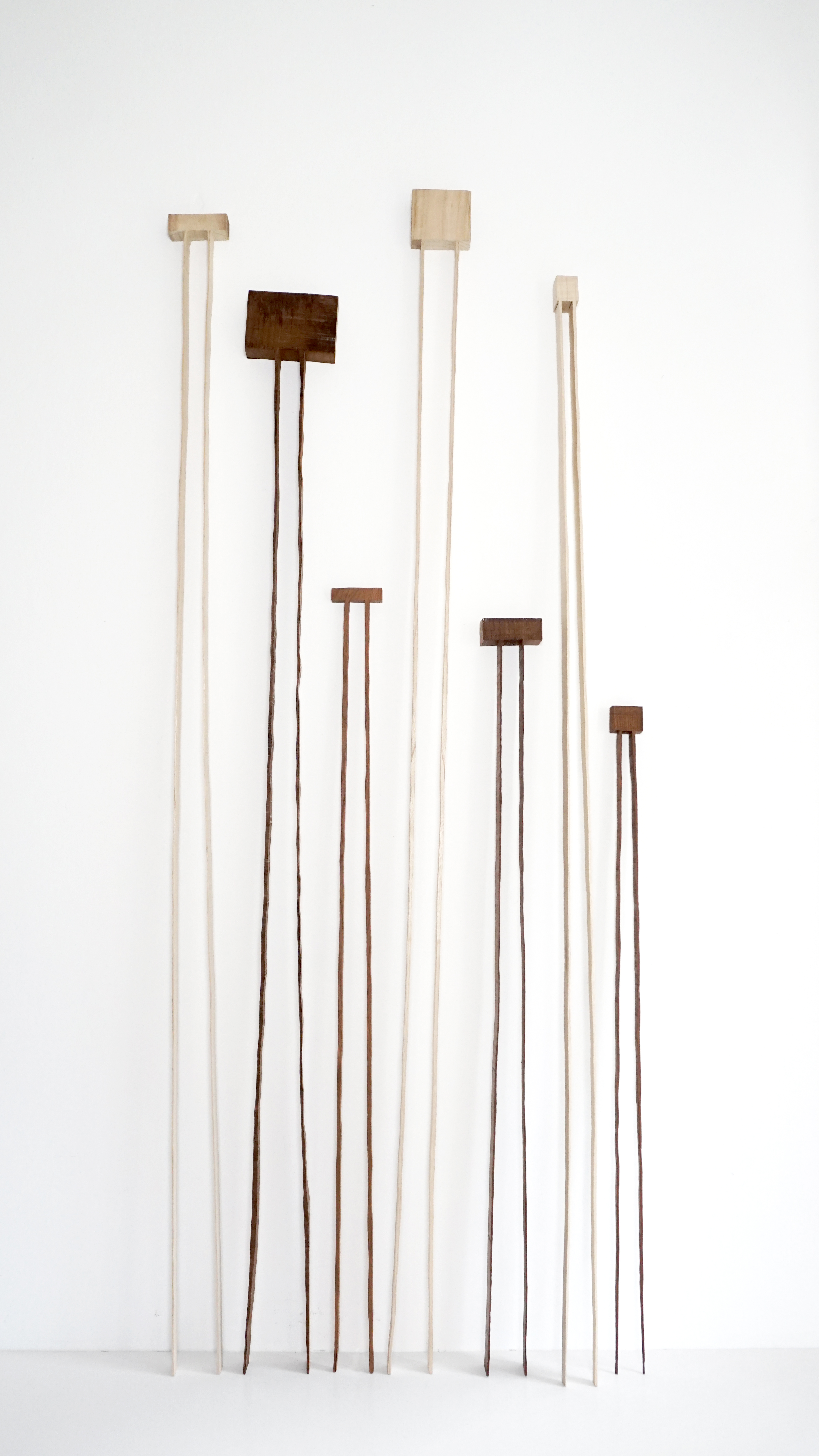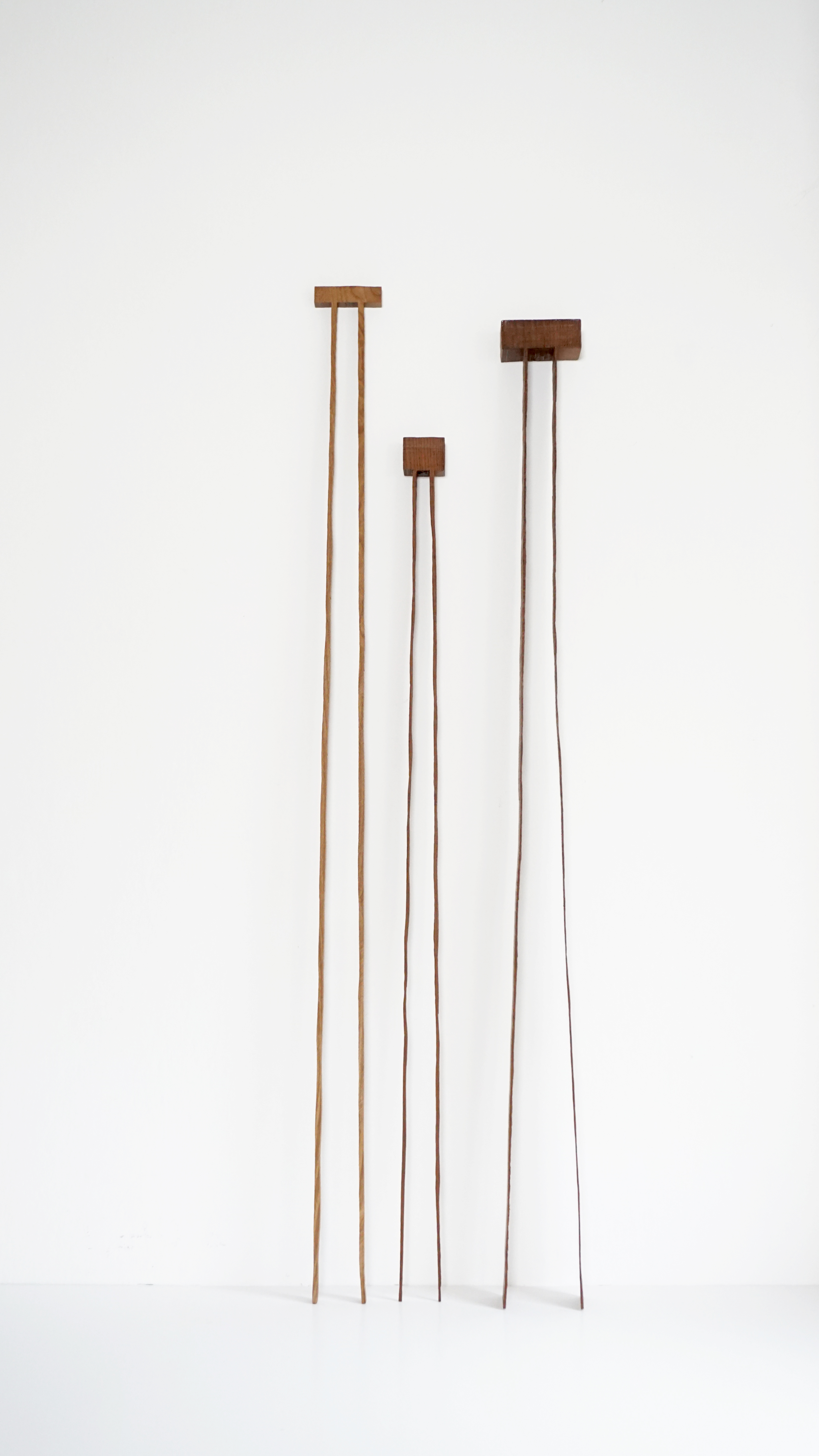 These elongated sculptures follow the theme of building a raised platform for sitting: two legs supporting a seat - an abstraction of and inspired by my work and development of traditional Japanese stools.